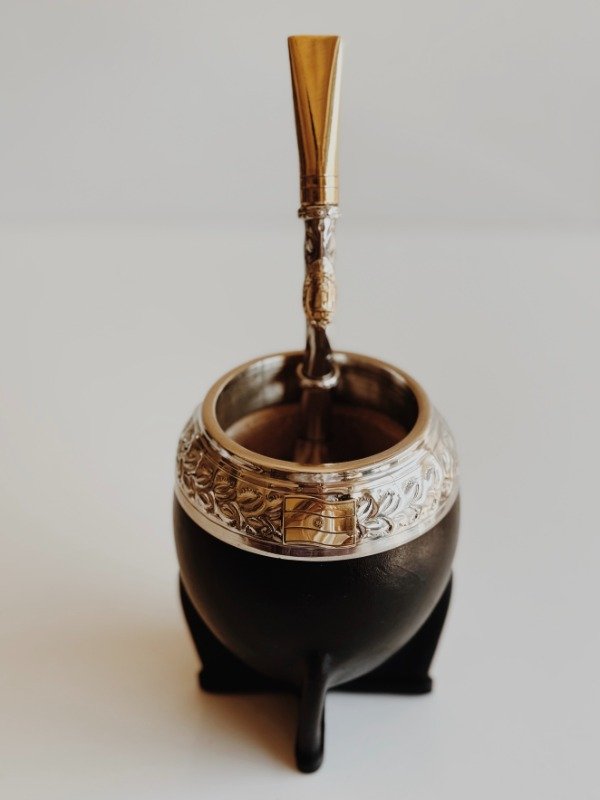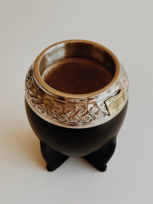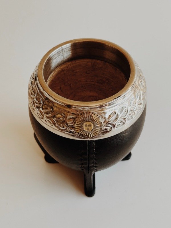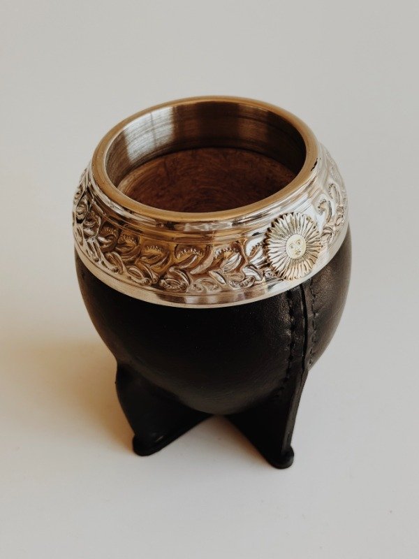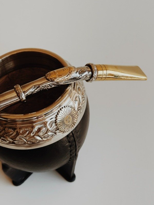 Mate Torpedo Uruguayo Virola Ancha - Apliques Sol de Mayo y Bandera Argentina - Cuero Liso :