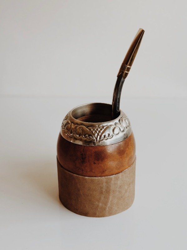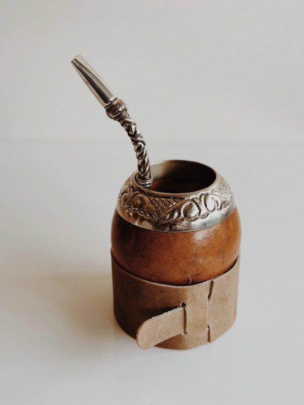 • Mate de calabaza natural pulida con forma de mate torpedo sobre base de cuero crudo abotonada hecha a medida para la calabaza respectiva.