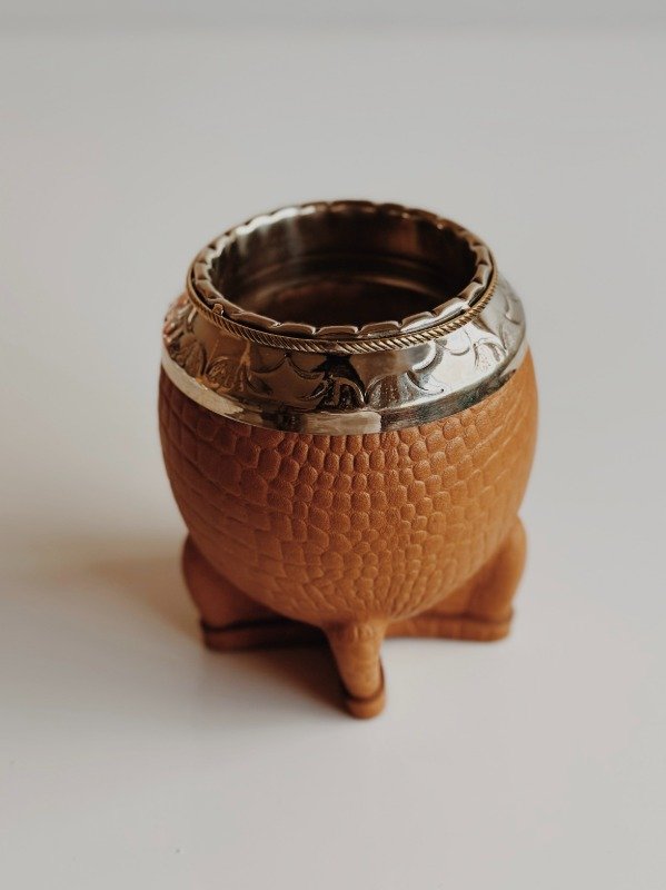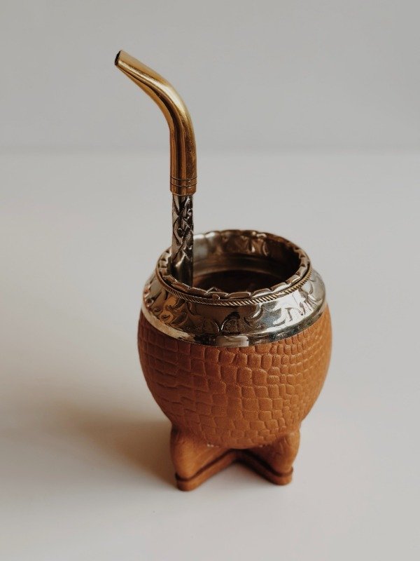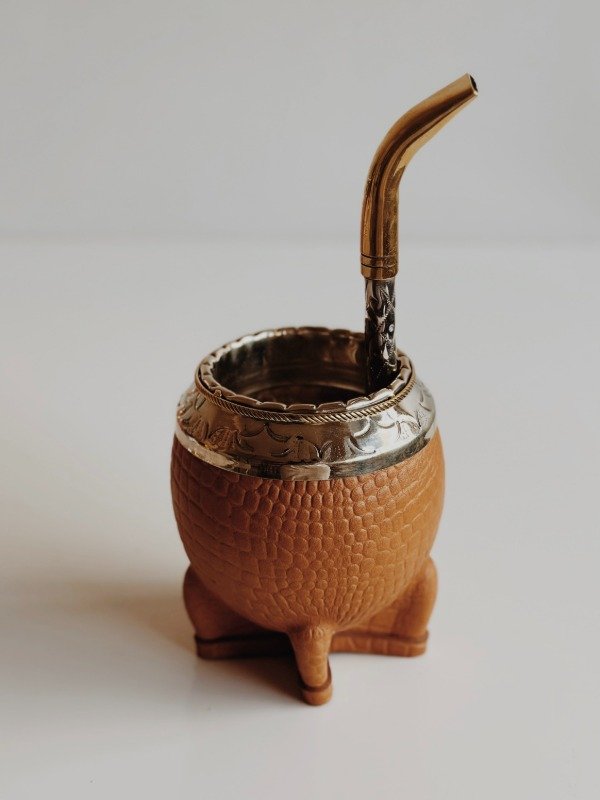 Mate Torpedo de Alpaca Cincelada - Cuero Croco - MEDIA CAÑA EN BRONCE: