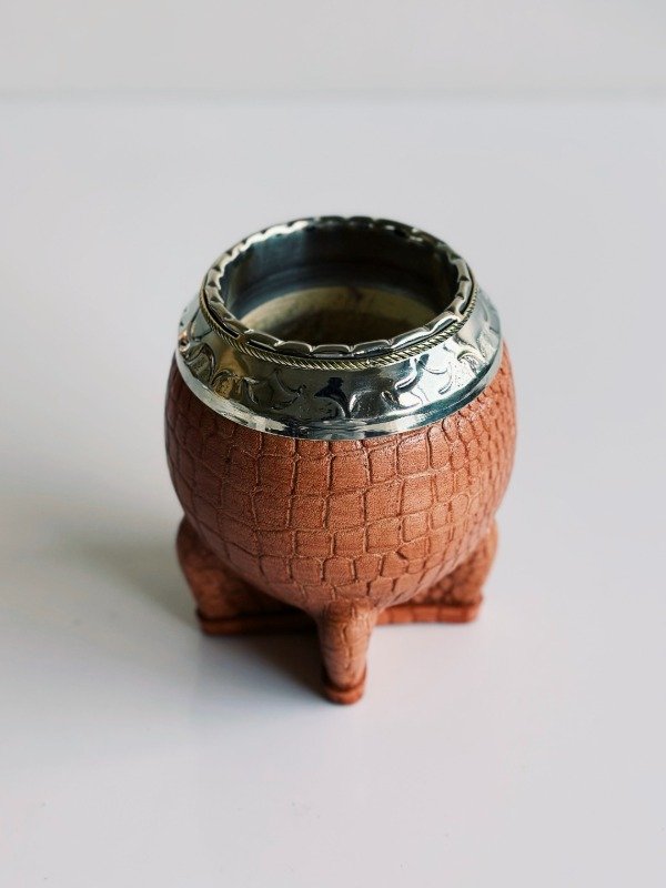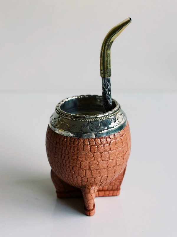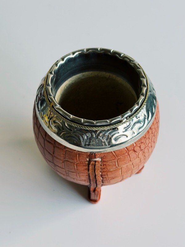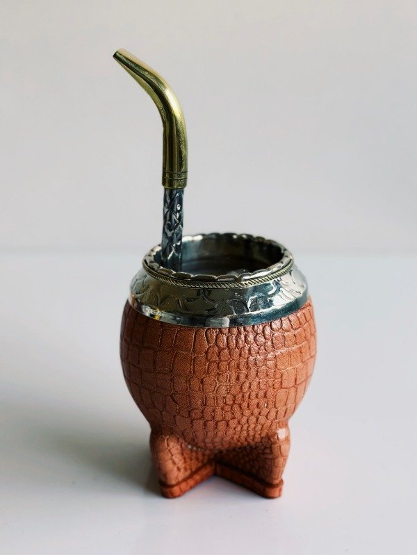 Mate Torpedo de Alpaca Cincelada - Cuero Croco - MEDIA CAÑA EN BRONCE: