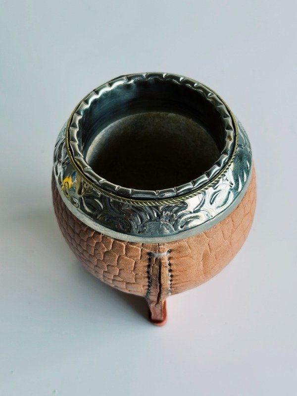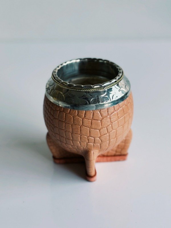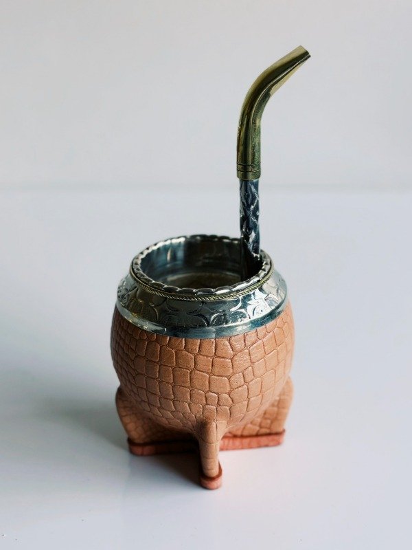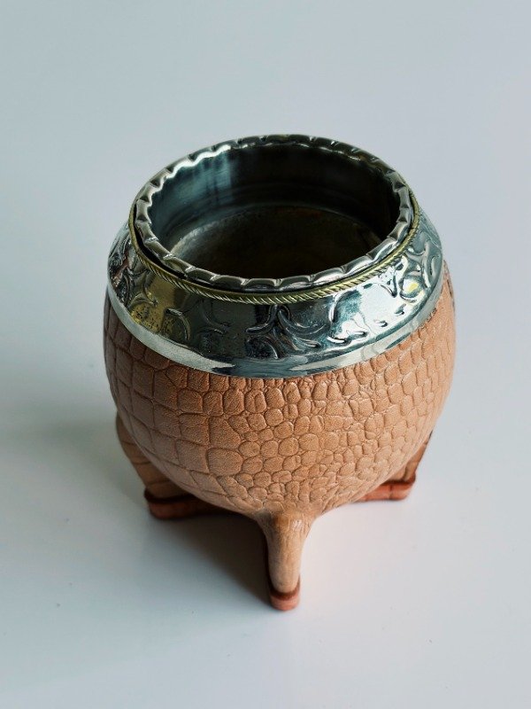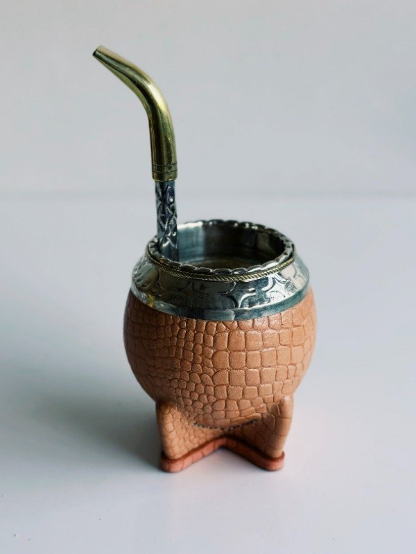 Mate Torpedo de Alpaca Cincelada - Cuero Croco - MEDIA CAÑA EN BRONCE: