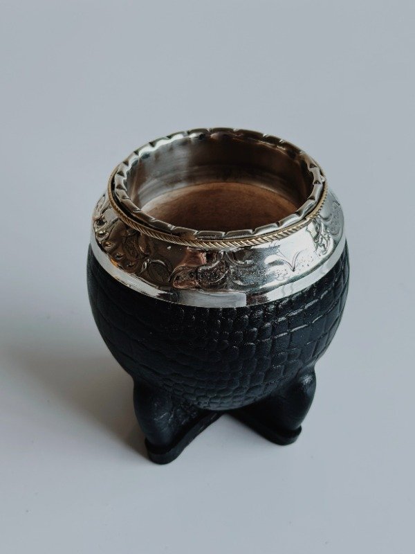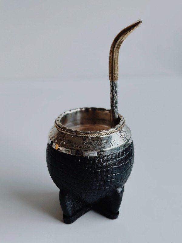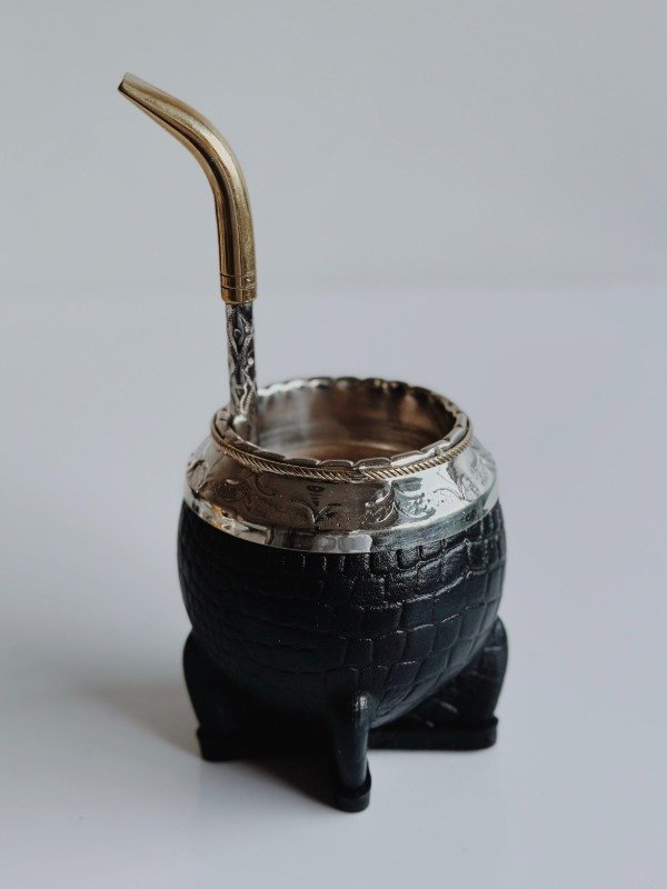 Mate Torpedo de Alpaca Cincelada - Cuero Croco - MEDIA CAÑA EN BRONCE: