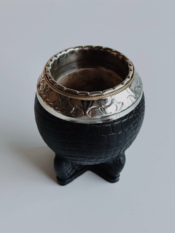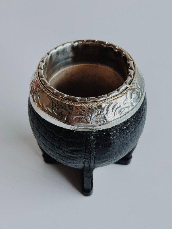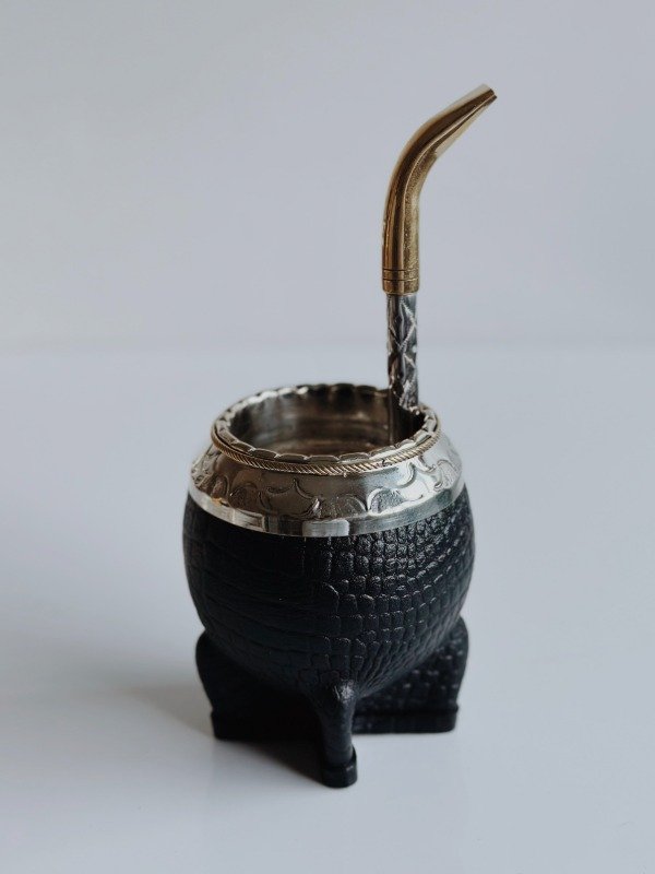 Mate Torpedo de Alpaca Cincelada - Cuero Croco - MEDIA CAÑA EN BRONCE: