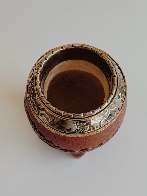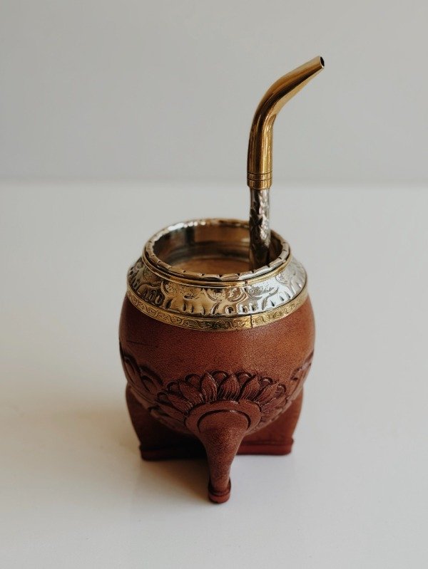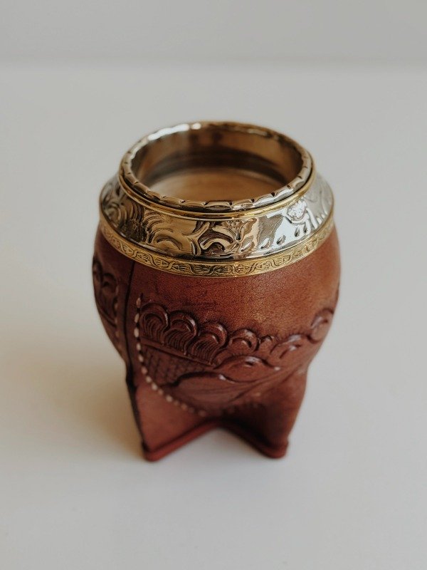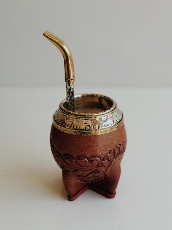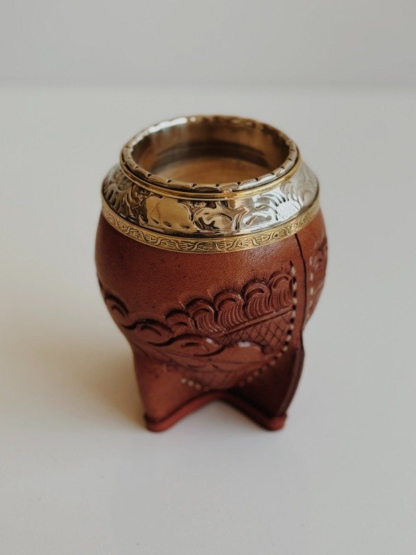 Mate Torpedo de Alpaca Cincelada - Cuero REPUJADO - DOBLE CAÑA EN BRONCE: